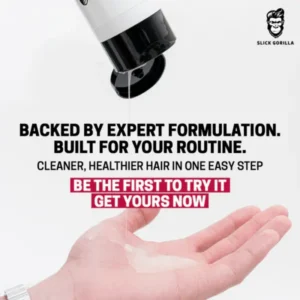Čistilni in vlažilni šampon-balzam Slick Gorilla s pantenolom in beljakovinami krepi lase, vnaša vlago, poravnava in daje lahek naravni sijaj.