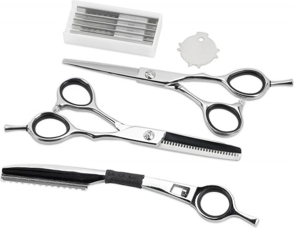 SPECIFIKACIJE: Mikro nazobčane škarje 5,5”Škarje za redčenje z 28 zobmi 5,5″ Britvica + 5 rezervnih rezil ključ žep z zadrgo Odstranljiv kavelj za prste HRC 57